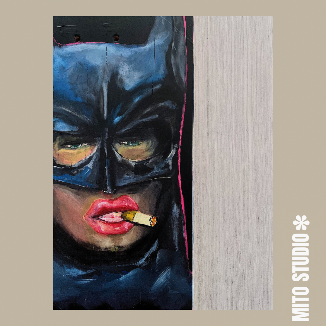 INTERVENCIÓN: Patineta recuperada con intervención en mezcla de acrílicos y pasteles.