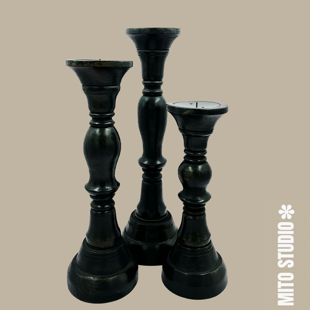 Es un trío de porta velas tallado en madera y entintado en color obscuro. Un toque elegante para tu hogar desde comedor o sala, hasta tu terraza.
